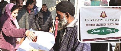 Srinagar, Jan 28: The University of Kashmir (KU) Tuesday organised a special social service camp at its Sir Syed Gate to facilitate devotees visiting the Hazratbal shrine on the eve of Shab-i-Mehraj.