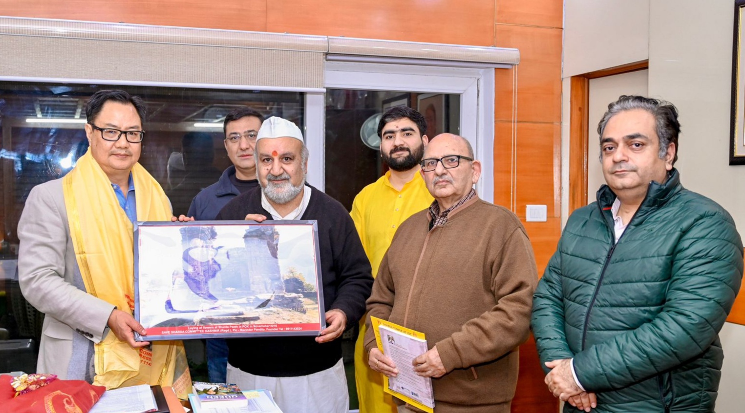 AIKS presented and felicitated Kiren Rijiju with a Sharda shawl and portrait and urged for reopening of Sharda Peeth PoK on the lines of Kartarpur.