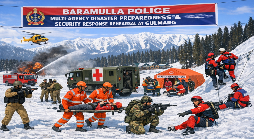 Baramulla, Jan 16: Baramulla Police on Thursday held a Disaster Preparedness and security response rehearsal at the Convention Centre, Gulmarg.