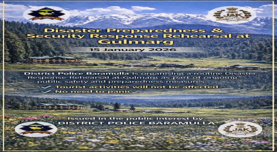 Baramulla, Jan 15: Baramulla Police will organise a Joint Disaster Preparedness and Security Response Rehearsal on Thursday in Gulmarg.