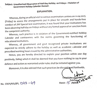 The Chief Education Officer Pulwama (CEO) Pulwama on has issued an explanation to three private schools of Pulwama district and asked them to discontinue the practice of observing half day holiday on Fridays.