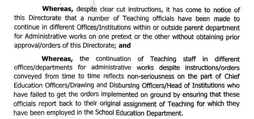 It reads that despite clear cut instructions, it has come to notice of the Directorate that a number of teaching officials have been made to continue in different offices within or outside parent department for administrative works on one pretext or the other without obtaining prior approval of the Directorate.