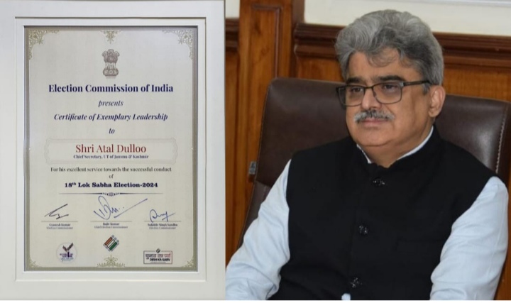 Jammu, March 3: The Election Commission of India (ECI) has recognised the services of Chief Secretary, Atal Dulloo for the successful conduct of elections for the 18th Lok Sabha in J&K UT.