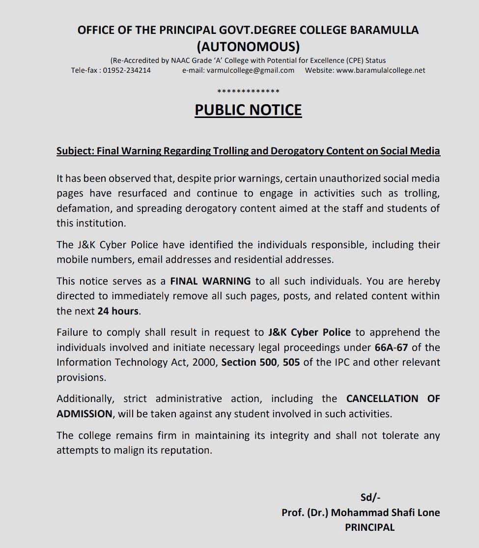 In the wake of this, a public notice issued by the Principal GDC Baramulla Prof. (Dr.) Mohammad Shafi Lone has stated that despite previous warnings, certain pages continue to malign the institution.