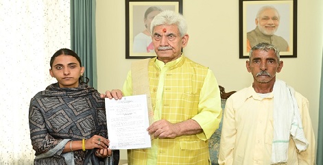 Jammu, March 27: J&K Lieutenant Governor Manoj Sinha on Thursdy handed over the appointment letter, on compassionate ground, to Renu Sharma, sister of Arjun Sharma, who was killed in Reasi Terror attack.