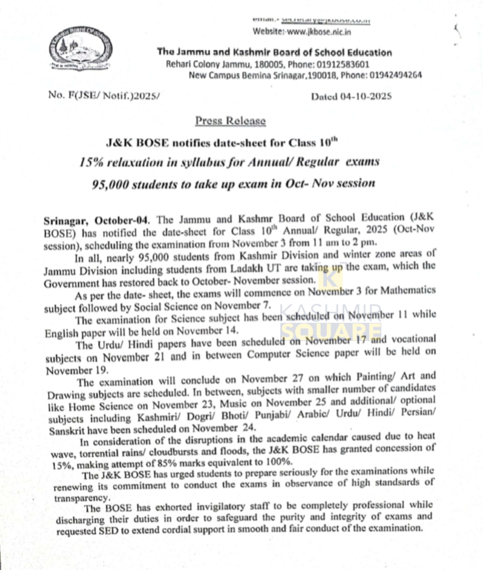 Srinagar, Oct 4: The Jammu and Kashmir Board of School Education (JKBOSE) on Saturday announced 15 percent relaxation for class 10th students in their upcoming annual regular examination.