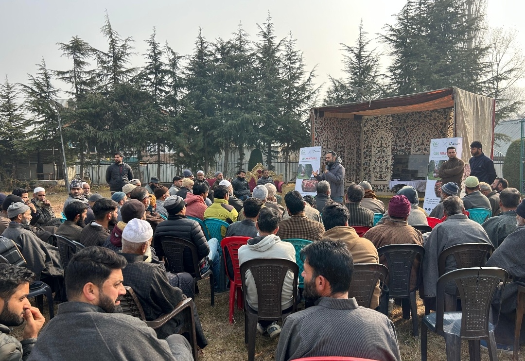 Pulwama, Dec 12: In a major step toward accelerating Kashmirs horticultural modernization, Qul, in partnership with Jammu and Kashmir Bank, organised an extensive awareness programme at Eid Gah Drabgam, Pulwama, to educate farmers about the High-Density Plantation (HDP) Scheme and the financial support available for adopting modern orchard systems.