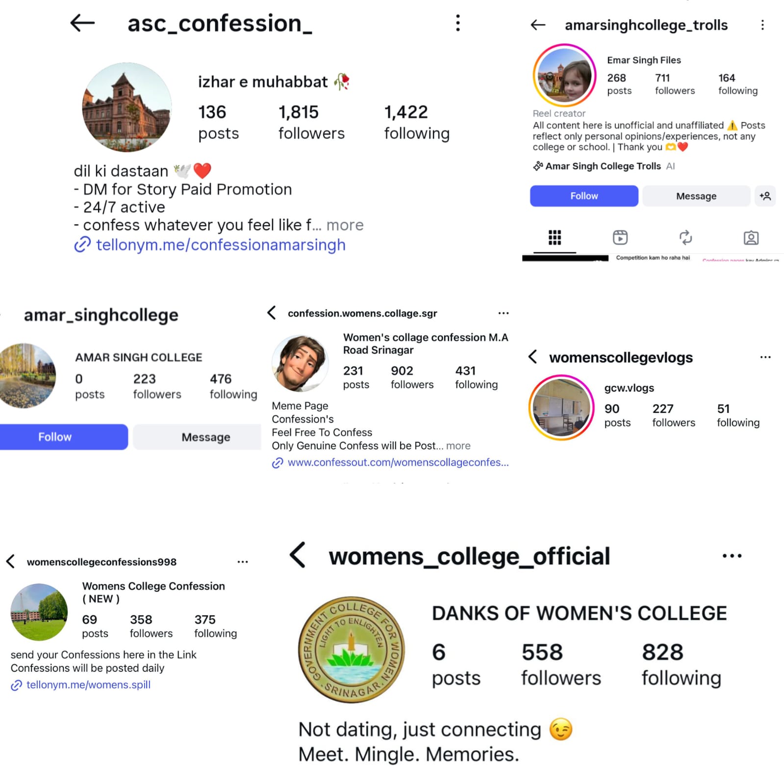 Examples of pages that may be operating with potentially mischievous intent using the college's name include @womenscollegevlogs, @womens_college_official, @womenscollegeconfessions998, and @confession.womens.collage.sgr.