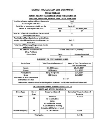 Besides making arrests, as many as 28 people have been convicted while narcotics worth Rs 2.42 Crore has been seized ad drug assets worth Rs 4.69 crores have been attached by Udhampur Police.